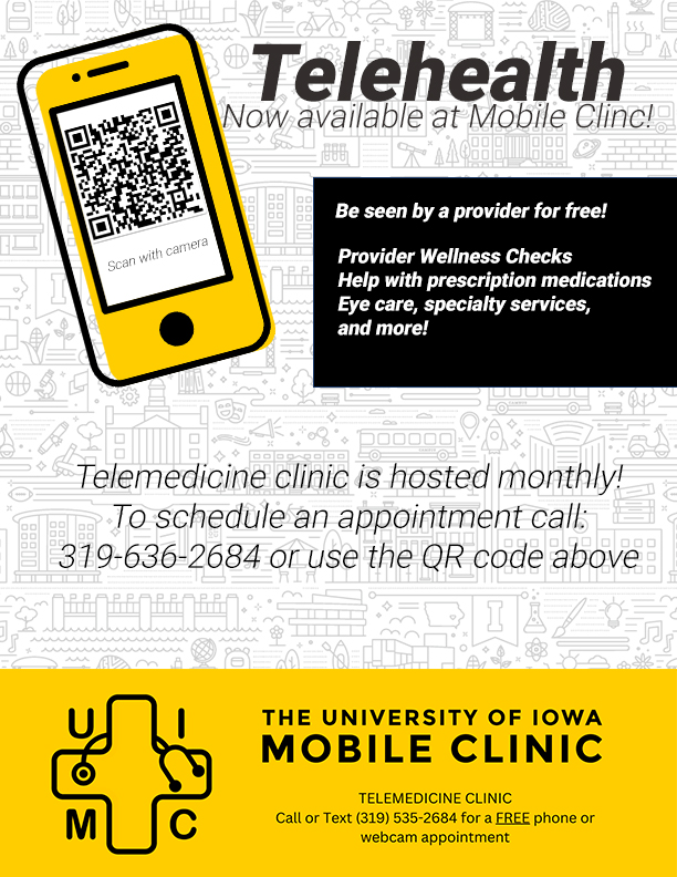 All appointments can be requested through calling or texting (319) 535-2684, or by completing the following link: http://tinyurl.com/TeleMobileClinic. Services can include aiding in chronic disease management and refills, acute minor medical illnesses, and mental health help.